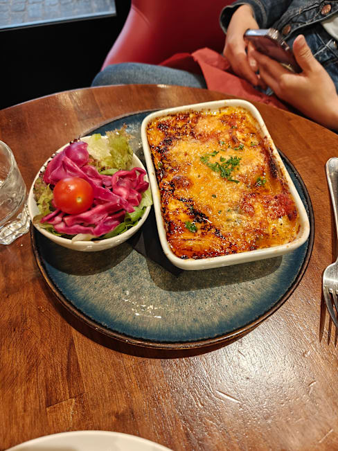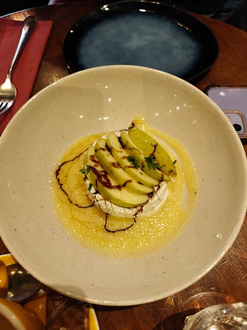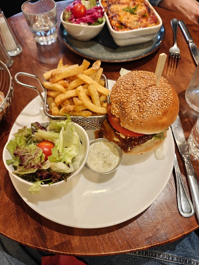 8/10Canmbert and apples was very good. Vegetarian pasta was good and came nice and hot. Crispy (chicken) burger was cold and served on a cold bun. Good sizes for all plates. We did not get The Fork discount but this was the first time using the app so didn't know what to expect and was not sure how to pay through the app.