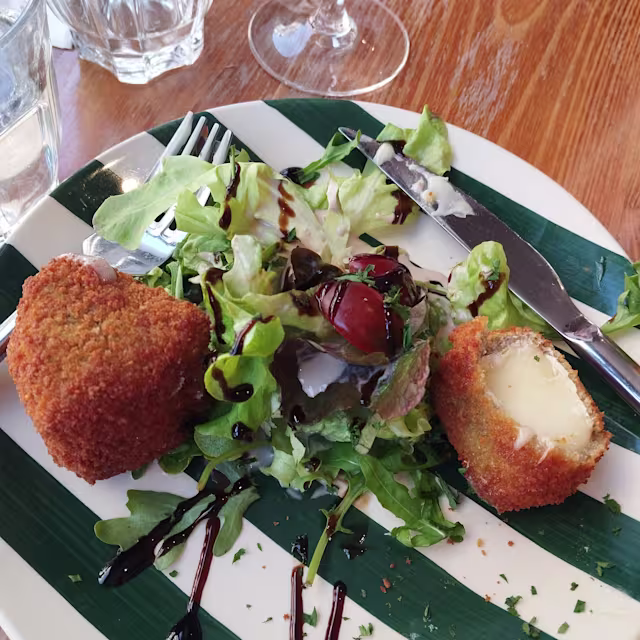 - Salade verte, tomates séchées, lardons fumés, brique de chèvre miel et aubergine, pommes de terres sautées, pommes