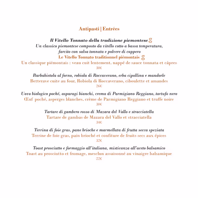 Service was terrible. We arrived at 7:30, and left at 10:30. I had to ask 6 times for a glass of wine. When they brought out the white wine, it was so warm we had to send it back. We had to cancel our main entrees because they were taking so long with service. In 3 hours all we had was an appetizer, one serving of pasta and dessert. Also, there were small children running around the restaurant. Would not go back, don’t understand how they have a Michelin star.