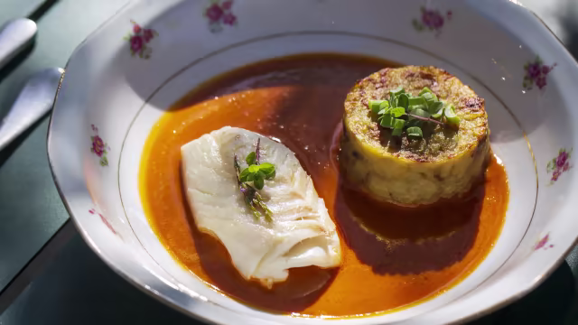 - Pavé de thon mariné avec sa sauce crémeuse au chorizo accompagné d'un écrasé de pommes de terre