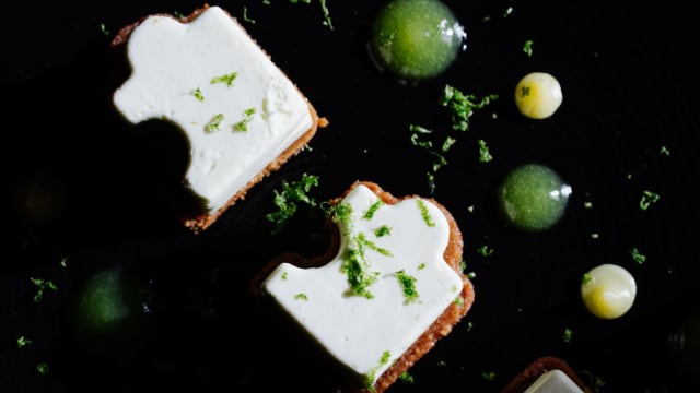 Emulsione di Saint-Marcellin (formaggio cremoso di latte vaccino), noci, pepe di Sichuan, pickles di barbabietola, erbe fresche e tegola di pane