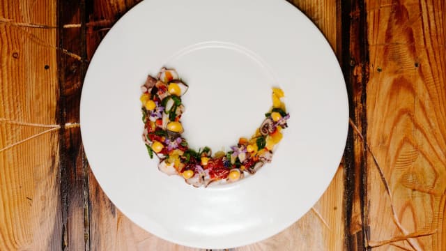Pollo Fermier della Valle, mousseline di maïs, funghi porcini freschi grigliati e fondo di pollo ai funghi