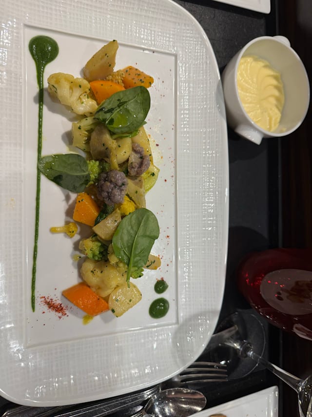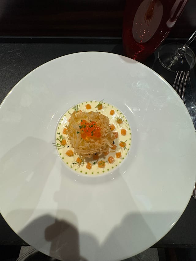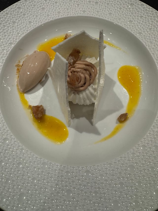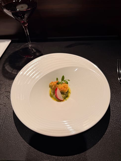 6.5/10+3The experience here is quite disappointing. We had lunch here and sat at the bar table, our egg dish was missing the crunchy cheese flake, we found our later because the table next to us ordered the same and we wonder why it look different. There’s no apologies and nothing from the restaurant, just act like nothing happened. Another server spilled the whole glass of water to our bar table neighbor. When I try to be nice and keep saying “Merci” to our server throughout the meal, he end up saying “it’s ok, I’m Italian”. It is quite a disappointing experience for a Michelin 1-star restaurant.