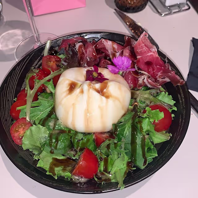 - Salade, tomates, oignons rouges, burrata, poulet crunchy, croûtons, oeuf, herbes fraiches