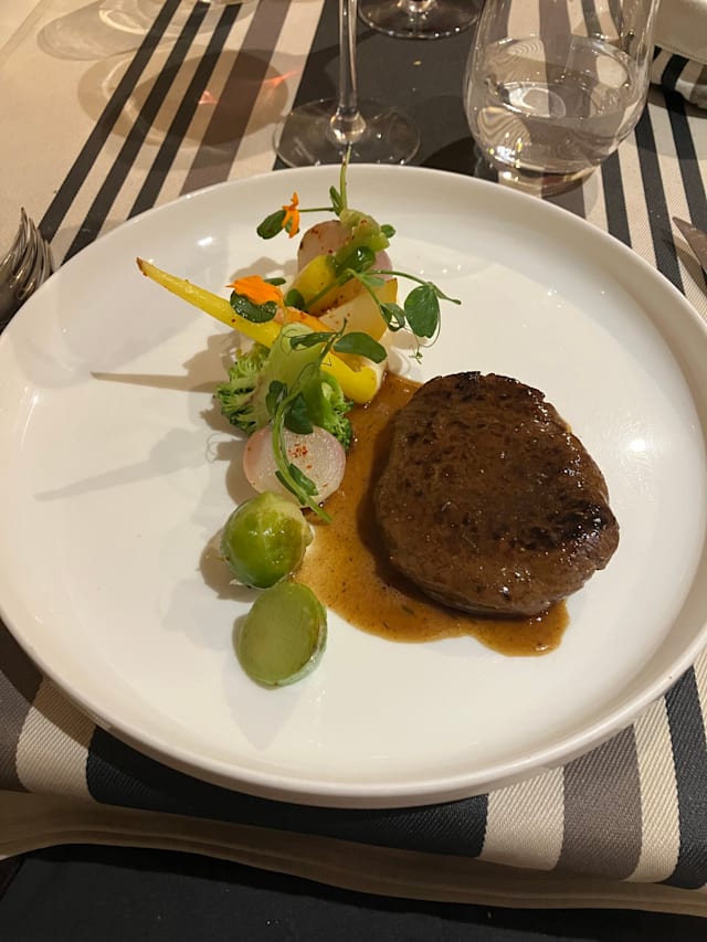 6.5/10Vey average experience, really nothing special. First I would note a server was lovely and charming, providing genuinely kind service. Otherwise I was totally disappointed by my dinner. With high scores and nice plating I expected a very nice dinner. First the menu was different from the one published on the website (even though it mentioned it should be valid the date I dined). The starter was nice enough and beautifully plated (filet de rouget poele). Then it was 55 minutes wait between the courses - just sitting and nothing happens. I was about to leave the restaurant when my Fillet de boef arrived. It wasn't the best quality, chevy, served with the most boring steamed totally tasteless veggies, jus was tasty tho. The lever of the dish is like not so good brasserie and not at all what I expected