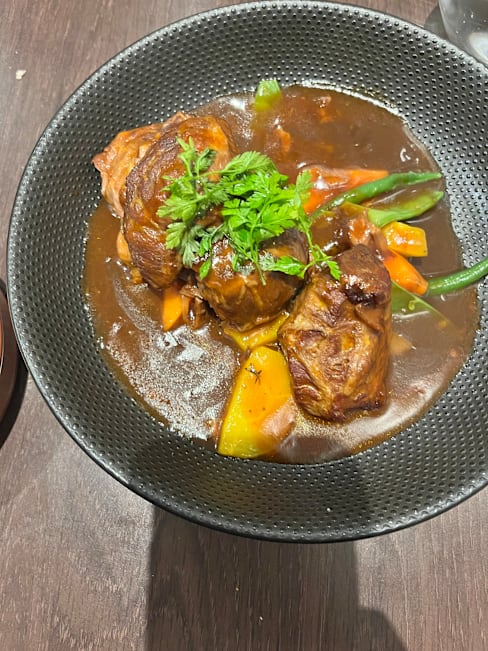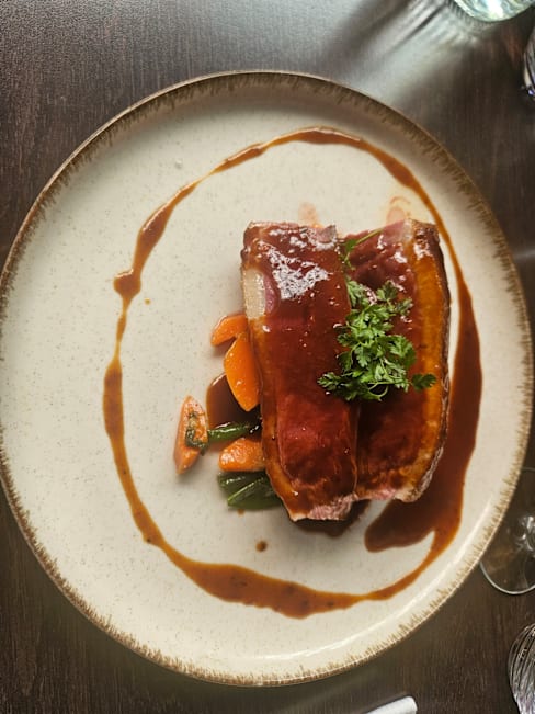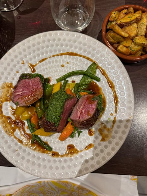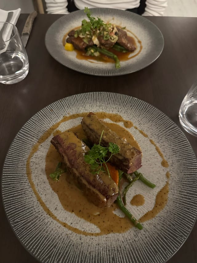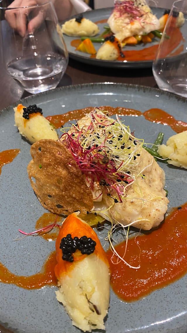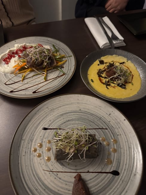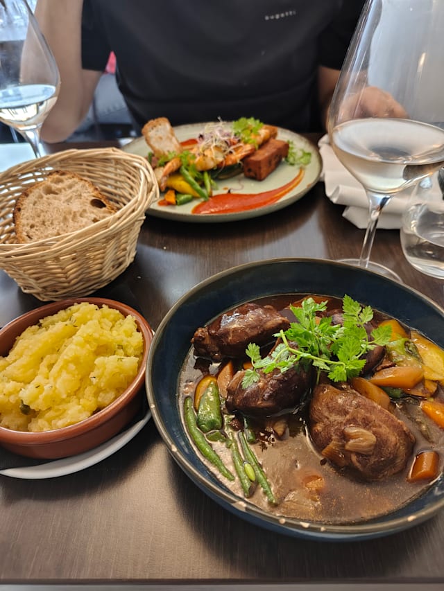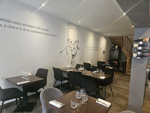 3.5/10This place is trying to be a fine dining and modern but unfortunately, it's not working out well. no physical menu - you have to scan QR code and order online but positions are very poorly translated from French to English. We asked for recommendations and ordered 2 different 'chef's specials'. Both meat options were dry and served in the exact same way on the exact same sides even topped with the same gravy. I would be very disappointed if I had to pay full price for this dinner. But even with thier discount, you can find many better options around for less money. Most of the time we spent there, we couldn't stop thinking that Paul Bocuse would turn in his grave if he saw his face on that wall... The place is cold and dreary.