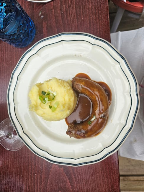 10/10Excellent onion soup, savory grilled sausage with mashed potatoes & grilled chicken Kebob with jasmine rice. Finished with the best run baba with whipped cream.