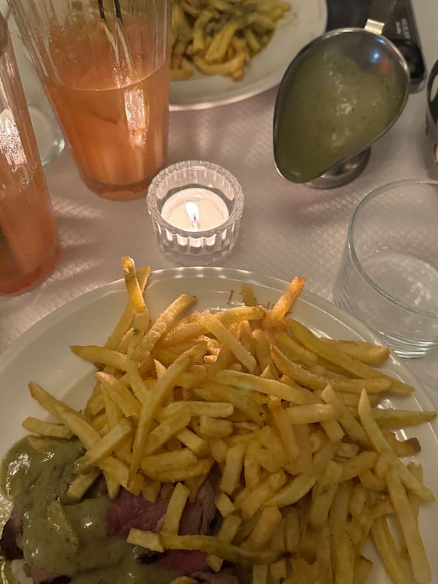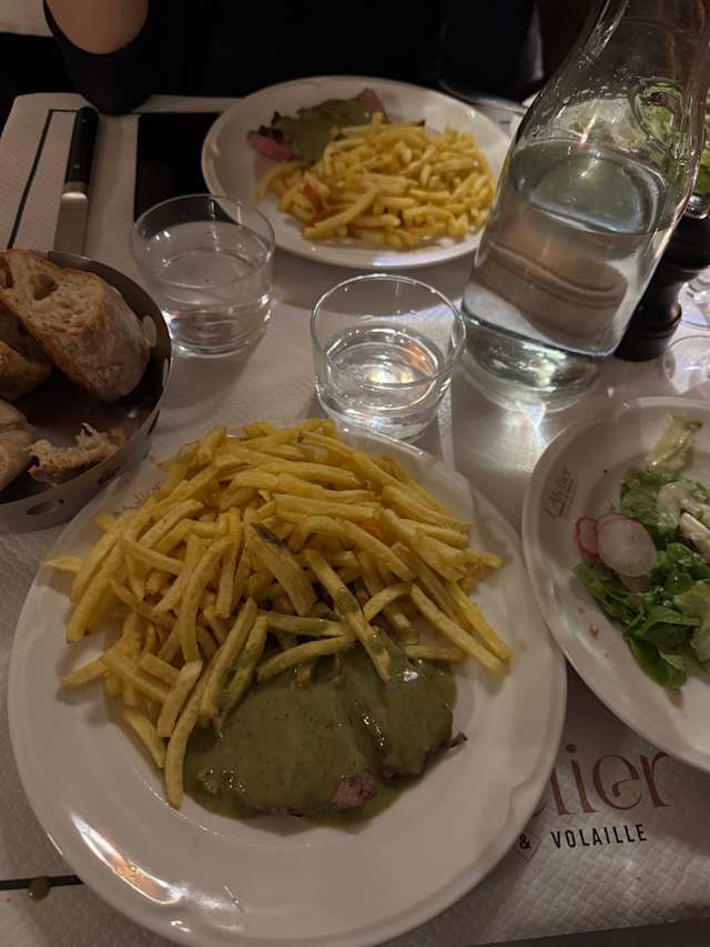 6.5/10Although the steak and frittes was very nice and good value, the service was quite poor and we felt that french guests on other tables were being favoured ahead of us Brits. Three tables that arrived later than us were served before us, and in one case, had finished our starter before we had ordered . We had been here some years ago and I recall the food being nicely served on a platter kept warm on the table, but this time the food arrived on one plate, followed by a second serve, as it could not all be fit on the plate - although we had to wait some time between servings.