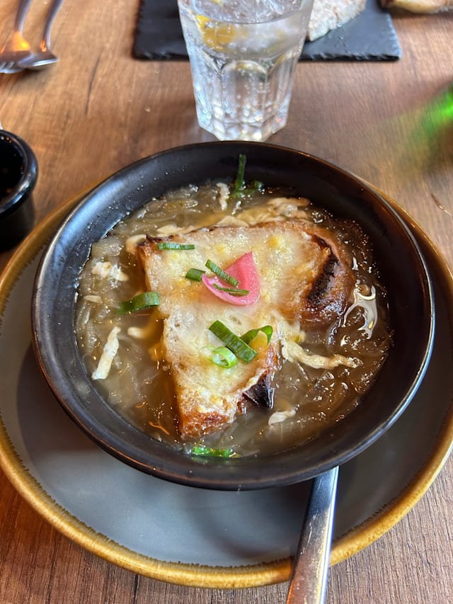 5/10Very good dessert.Not clean tables.Not clean bathroom.Too smelly.Not good quality of the main plate.Very tasty onion soup.Very good service.