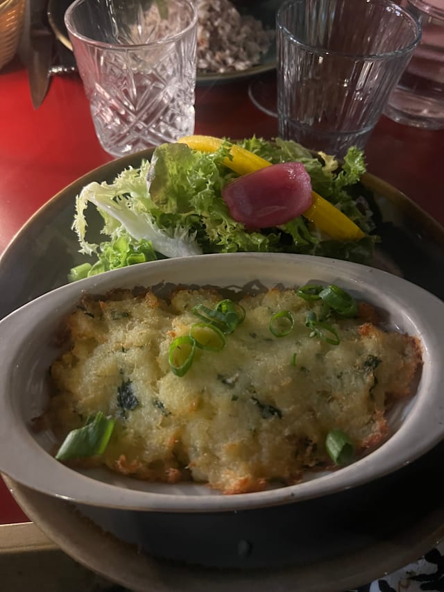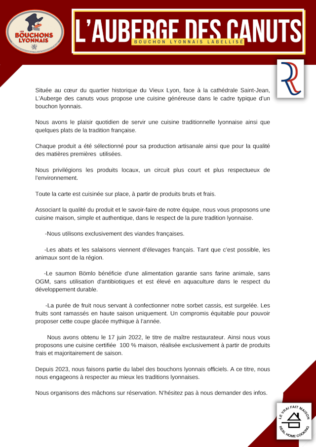 10/10L'Auberge des Canuts was one of the few traditional Bochon restaurants in old town Lyon that offers dinner earlier than the usual 7pm, so we made a reservation for 6pm dinner. The service was outstanding and we were able to communicate to our server in English. I wanted to try an authentic Lyon specialty so I chose the Quenelle baked in a casserole with crayfish sauce. It was heavenly! My husband had the Beef Confit which he loved. We had a small bottle of local Beaujolais wine which was delicious. We highly recommend L'Auberge des Canuts!