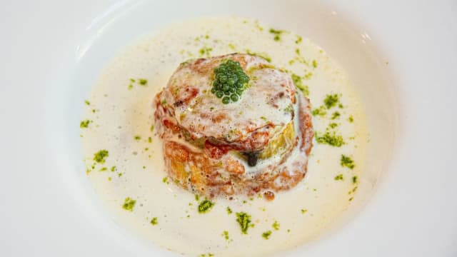 Servis avec une crème légère au safran et une mousse au jus de bœuf