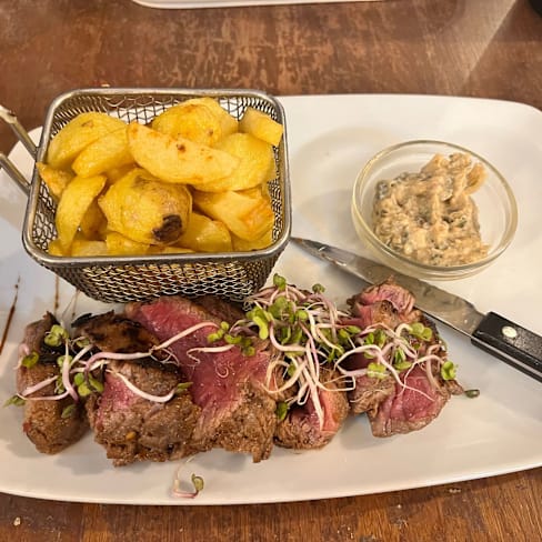 9.5/10Perfectly cooked meat and delicious fresh fries. Very child friendly. Wonderful service. Will be coming back with friends when they come to visit as we live nearby. A neighborhood gem.