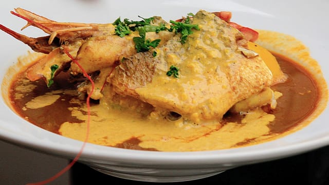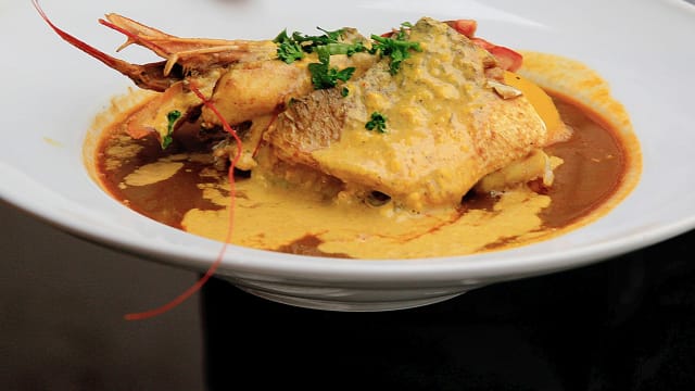 Dégustation d'une bouillabaisse individuelle, de beau poissons, trois beaux filets de gallinette, dorade, loup,avec une gambas ainsi qu'une pomme de terre safrané, servie sous une soupe de poisson de roche, issue de la pêche locale du petit port du Vallon des Auffes.