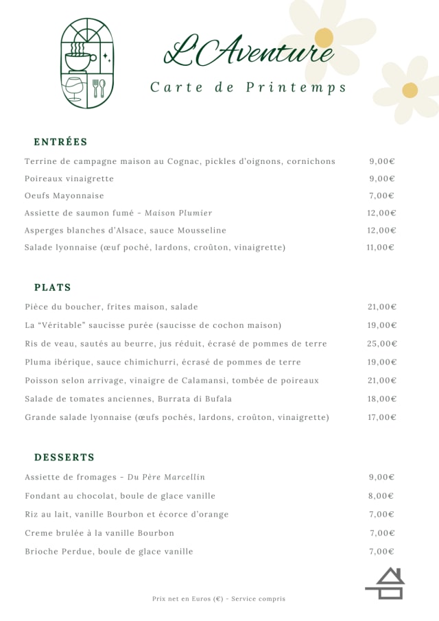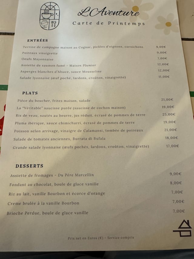 10/10In Lyon and unsure where to have dinner, I selected L’Aventure after reading some positive reviews. The reviews were not wrong. The restaurant, with its young chef, represents the model of a family run restaurant. Simple, but beautifully prepared and delicious food ( of particular note was the crème brûlée), together with wonderful and friendly service (especially the chef’s mother, and restaurant owner, who was there in her spare time purely to help her son out) all made for a great evening. Nothing to fault, lots to love