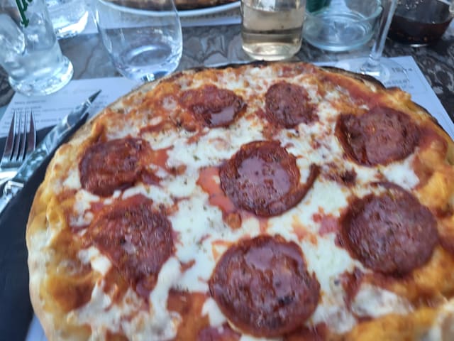 2.5/10The restaurant is located directly at the street - so if you have a table outside you have to come to terms with the noise and smell of the passing cars. Concerning the meal: The bottle of San Pellegrino was served with a pre-opened and soiled cap and an obvious amount of water missing. I guess the bottle was re-filled with some kind of no-name carbonated water. The snails were okay, however they were served with chips instead of bread - what I cannot understand. The carpaccio was floating in oil - as well as the pizza - which was big and looked good - unfortunately it was quite tasteless. The linguine bolognese were also unspectacular. All in all this was a really disappointing experience.