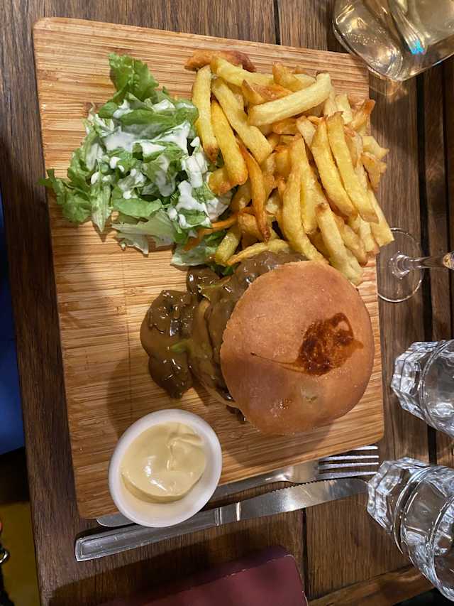 - Viande de bœuf hachée sur place, 125g camembert AOP, calvados, champignons de Paris