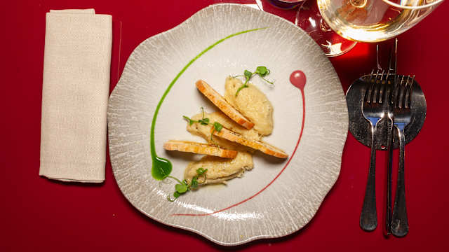 - Carpaccio di manzo piemontese adulto con maionese alle acciughe, nocciole tostate e scalogno caramellato