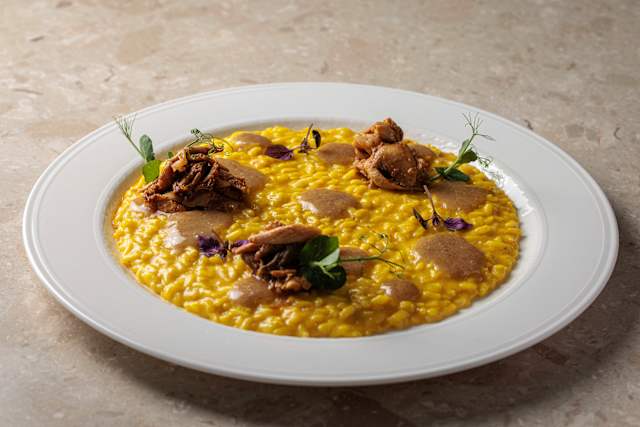 - Risotto al cavolfiore e zafferano, pesto di noci e straccetti di coniglio.