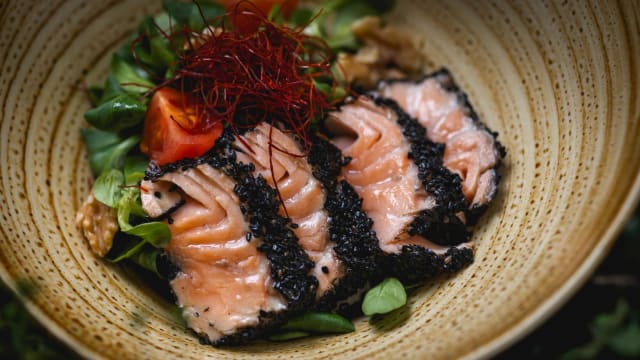 Medaglione di faraona* con tartare di tonno*, purea di carote e salsa teriyaki