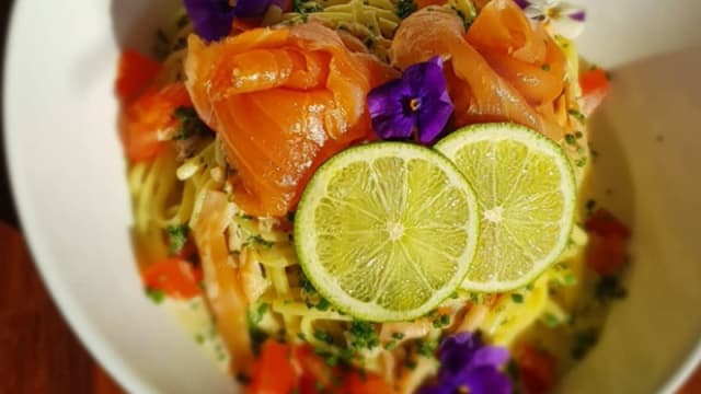 - Crème, ail, tomate cerise, basilic, saumon fumé