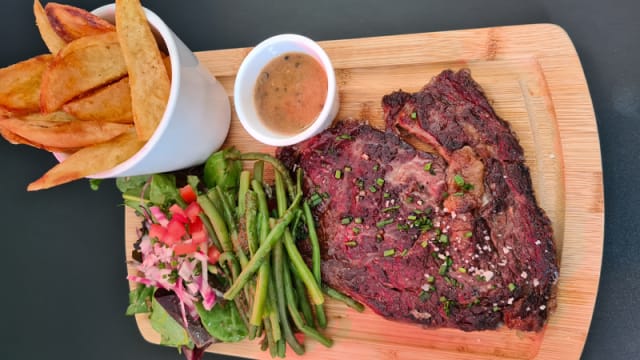 - 250g bœuf, frites, sauce maison (poivre, bleu, bourguignonne)