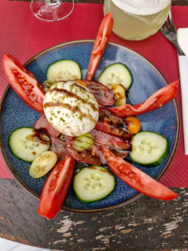Brushetta, purée d’avocat, tranche de saumon fumée & oeuf servi avec salade, vinaigre balsamique