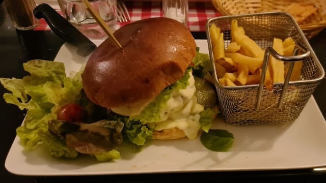 Les burgers (pain brioché, 180g de viande de boeuf, frites, salade)