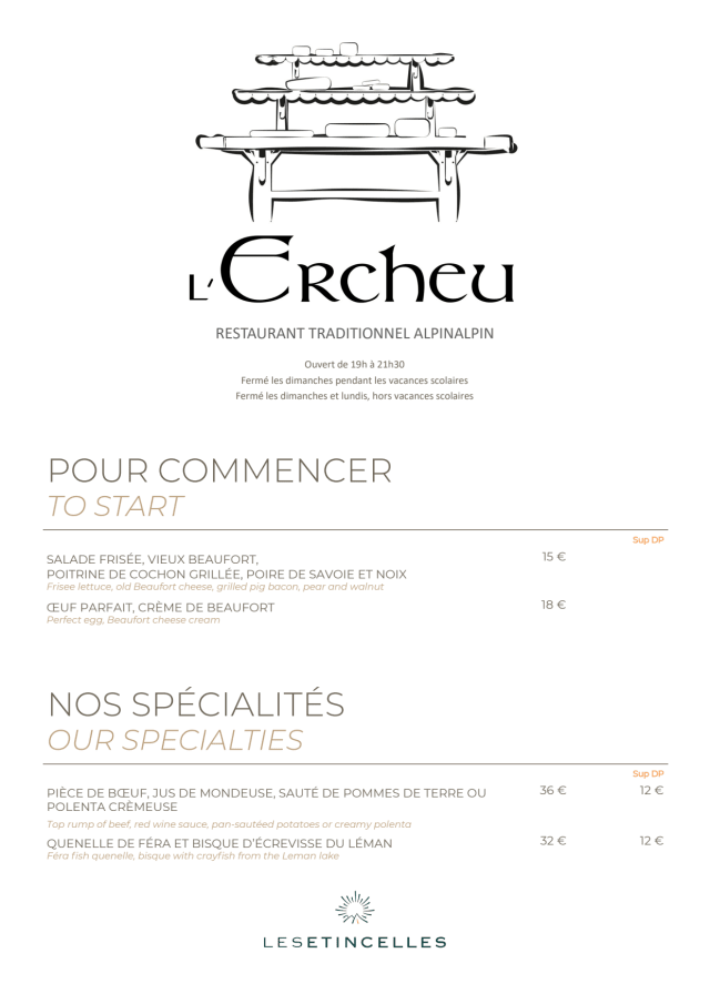 Dans une ambiance plus feutrée et intimiste, l’équipe de l’Ercheu, notre second restaurant, vous accueille tout l’hiver pour vous proposer une véritable expérience savoyarde. Pour accompagner la neige et recharger vos batteries après une journée de ski, savourez des plats chauds, traditionnels et ré...