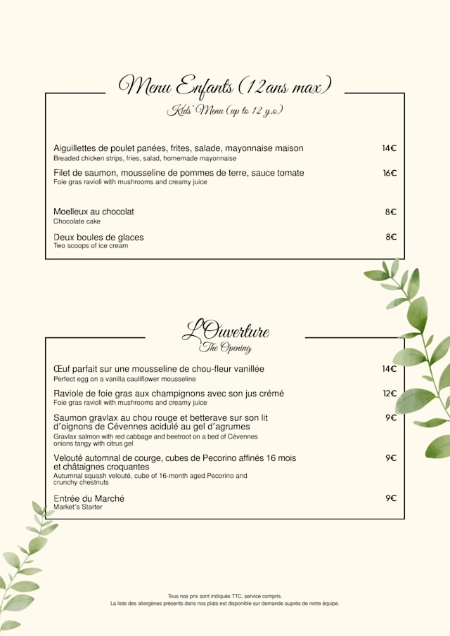 Brunch 45€ / enfants 12.90€ (de 5 à 12 ans) €45 per guest