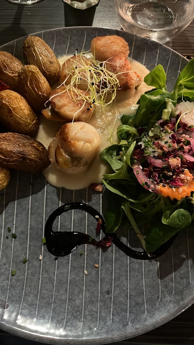- Poêlée de St Jacques sauce Mornay et Amandes , Risotto d'Orzo et gratin de choux fleur curry coco