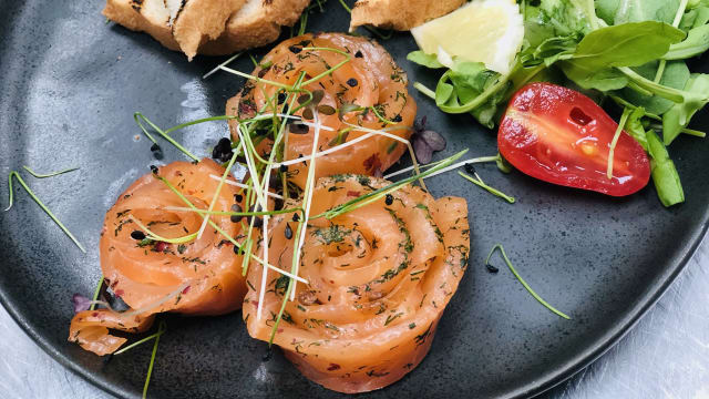 Tartare de Saumon , céleri rémoulade aux raisins de Corinthe , crème de Raifort à l'aneth