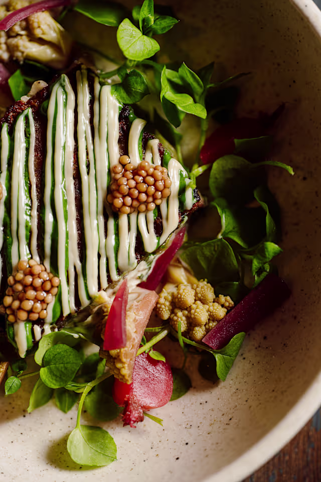 - Thon croustillant, sauce yuzu, aneth, salade de chou rouge