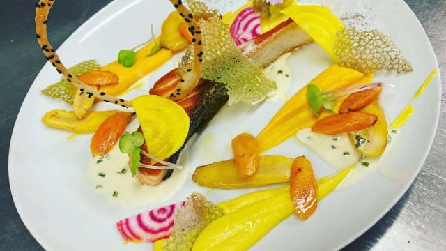 - (petits légumes en cuisson sous vide, beurre blanc crémé aux agrumes)