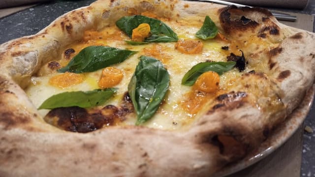 - Datterino giallo schiacciato a mano, fior di latte, datterini gialli semi dry, basilico fresco.
