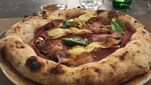 - Crema di olive nere, ricotta fresca infornata, salame sant’angelo, pomodoro pelato italiano biologico, 'nduja calabrese.