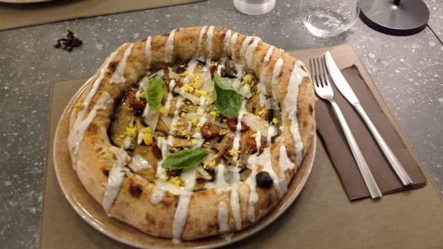 - Cottura a vapore a 120°, fritta a 180°, al forno su pietra a 260°. Passata di pomodoro rosso siculo, vastedda del belice, emulsione di olive nere, origano dell'etna, olio evo terraliva.