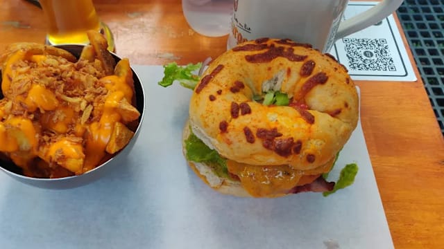 Boeuf (ou végétarien), raclette, échalotes confites, poitrine fumée, mayonnaise maison