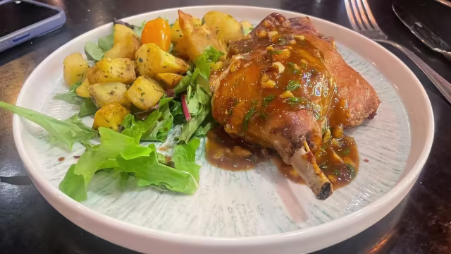 - Confit à basse température pendant 9h, pommes sautées à l'ail