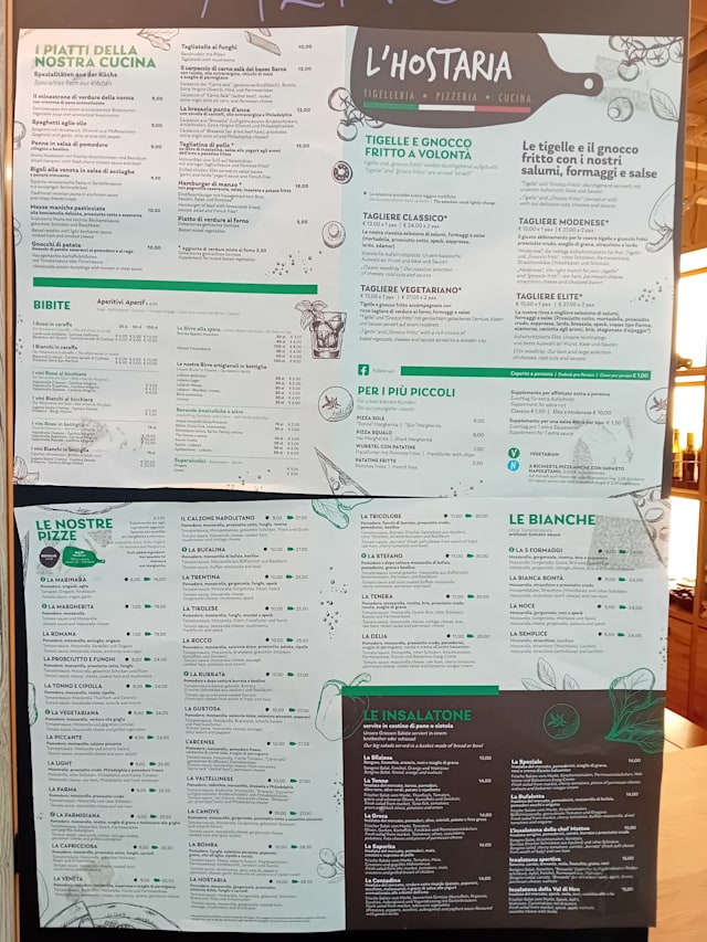10/10An overnight stopover in Affi required a nice place to eat with parking . The clean, cool underground garage (free) which opened into a bright shopping arcade with large L’Hosteria on 2nd floor was perfect. The waiters were charming and efficient. The menu was helpfully in Italian/German and English. The choices were good, the food excellent and the prices good value.