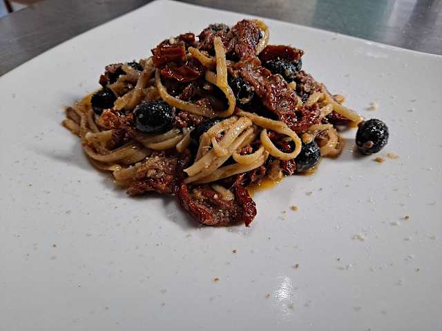 - Stroncatura con baccalà, olive nere, capperi e pomodoro