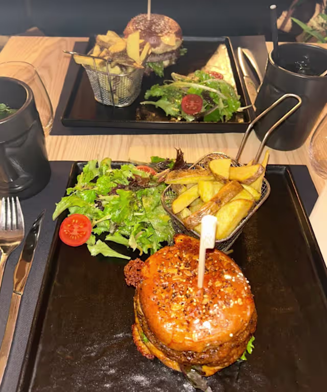 - Gaufre de pommes de terre garni d'un steak haché (150g), champignons, salade, fromage à raclette. Servi avec des frites.