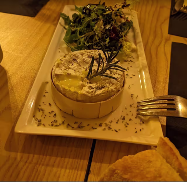 - Camembert entier rôti au four, fondant à cœur, parfumé aux herbes de provence et au miel. Servi avec une sélection de charcuterie, accompagné de frites maison et salade