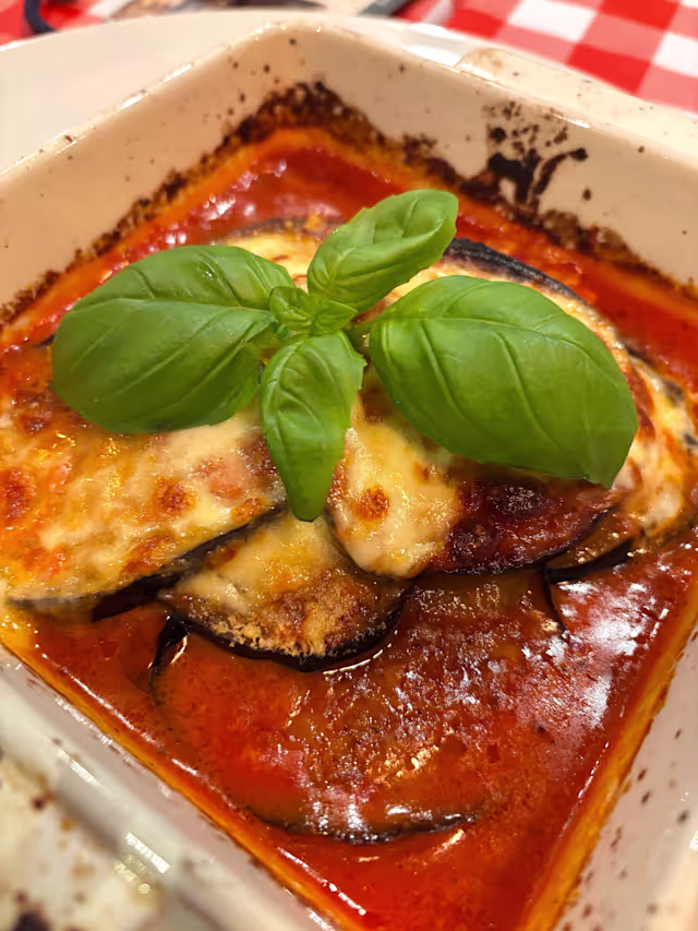 - Aubergine, pomodorosaus, parmezaan, mozzarella en bassilicum uit de oven