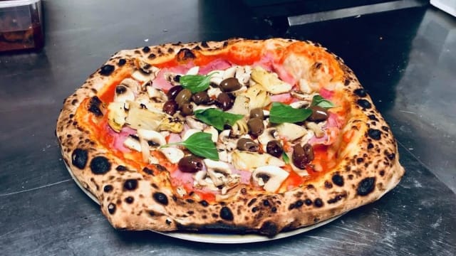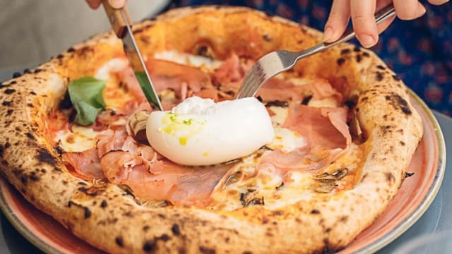 - Tomates san marzano dop, ricotta, mozzarella f.d.l, jambon cuit, oeuf, basilic.