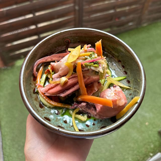 Tentacules de poulpe, brunoise de légumes marinés aux épices