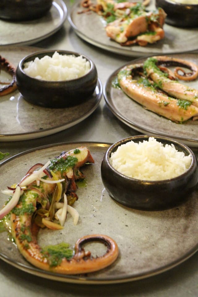 Tentacules de poulpe à la persillade julienne de légumes croquants et marinés accompagné de riz