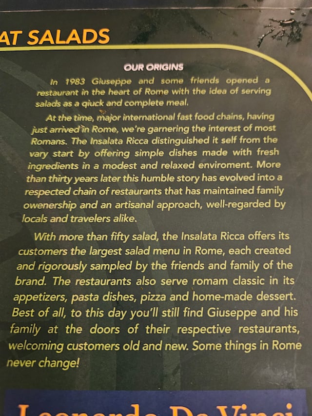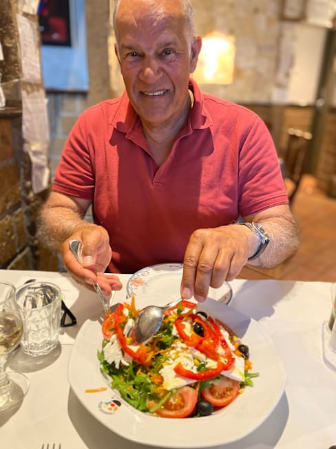 10/10This restaurant may look like a tourist trap, but it is not. Every time we visit Rome, we come to L' Insalata Ricca. Why, you might ask? For several reasons, the menu is extensive, the prices are reasonable, the service is excellent, and the food is consistently good. Last night, we came for the second time this trip, and we were not disappointed. All of the staff makes you feel so welcome and all add to giving you a good dining experience. Dalia was our primary server last night, and she was terrific. We enjoyed their house red wine – very robust and drinkable. My husband and I shared the Ravioli with spinach and ricotta in the most delicate sage butter sauce as well as a 4 Cheese pizza. Both dishes were loaded with flavor. My husband always like to end on sweet note and chose the chocolate cake. It was a dense cake with layers of chocolate ganache. Can I tell you how happy he was? Exceedingly, we both were. Thanks again for another delicious meal!