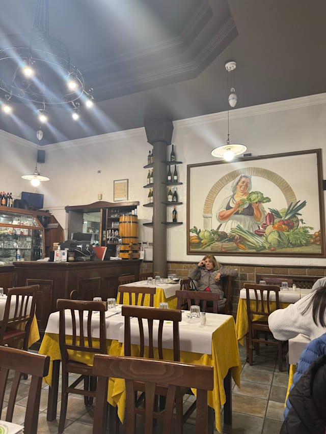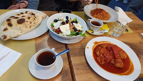 8/10Me (from Ukraine), my half-friend (from Uzbekistan) and her neighbor (from China) flew to Rome for the first time. The food at the establishment is good. The atmosphere is average, nothing special, but close to the Vatican. We ordered: "- Spaghetti with tomato sauce and basil - Farmer's ( Vegetarian salads), - Calzoni: Mushrooms, - Roman chiken. - Chocolate mousse." The portions were large.