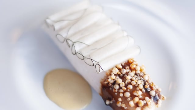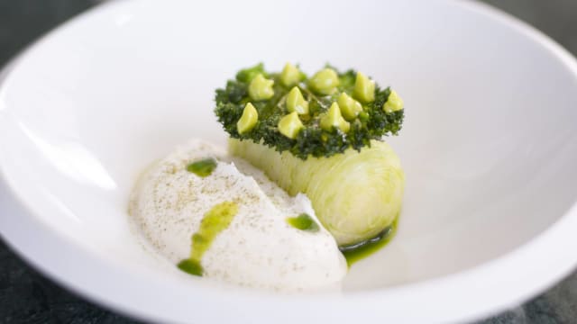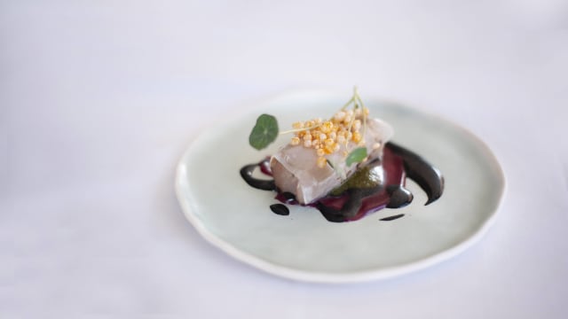 - Maquereau de ligne grillé, navet mijoté aux algues, jus sombre d'arrêtes