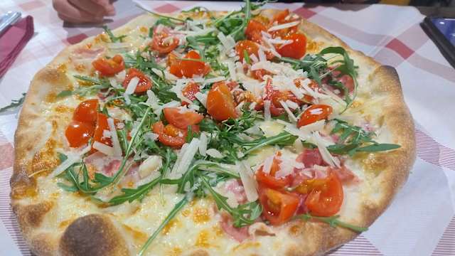 - Mozzarella, grana, svizzero, prosciutto cotto, pomodorini e rucola